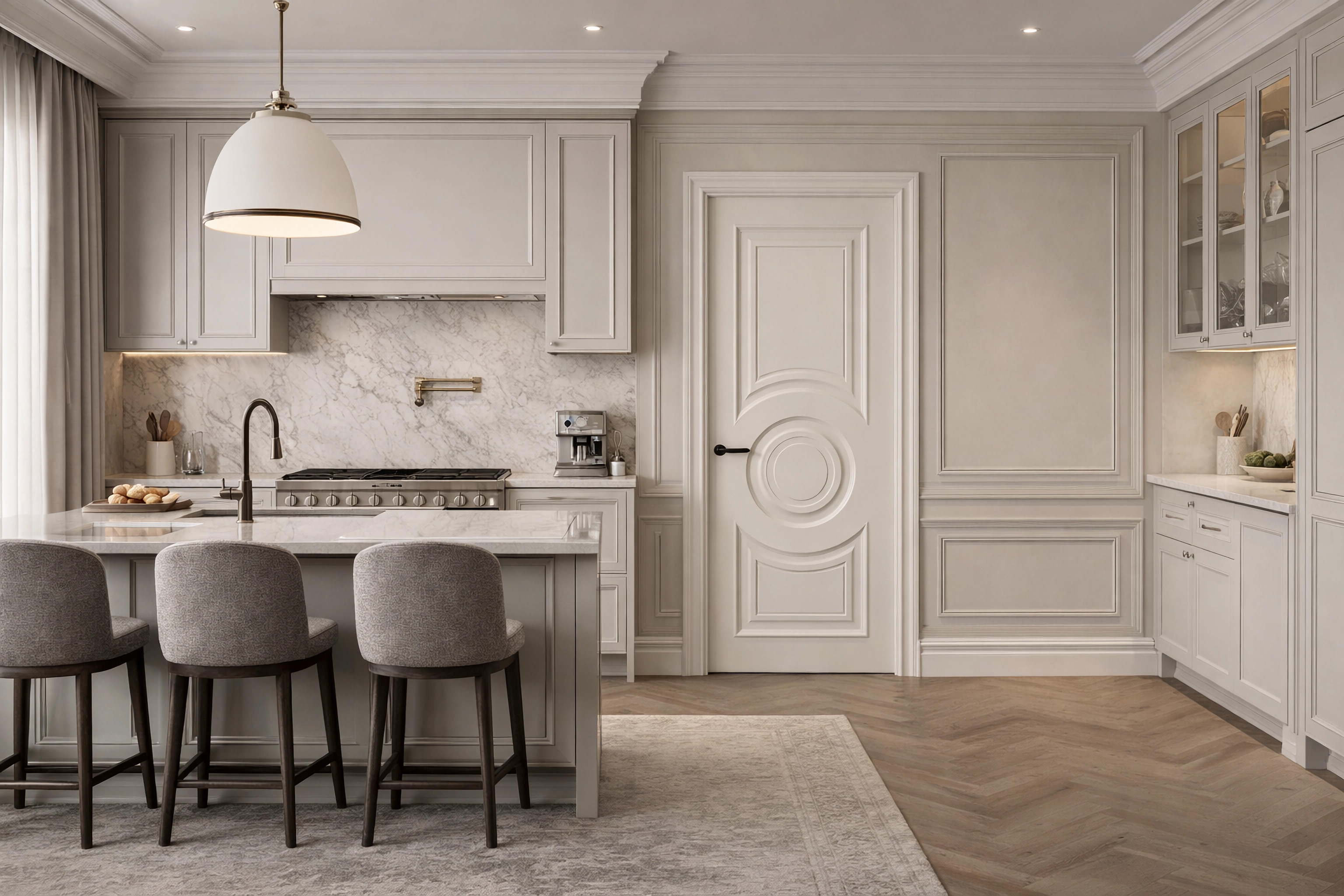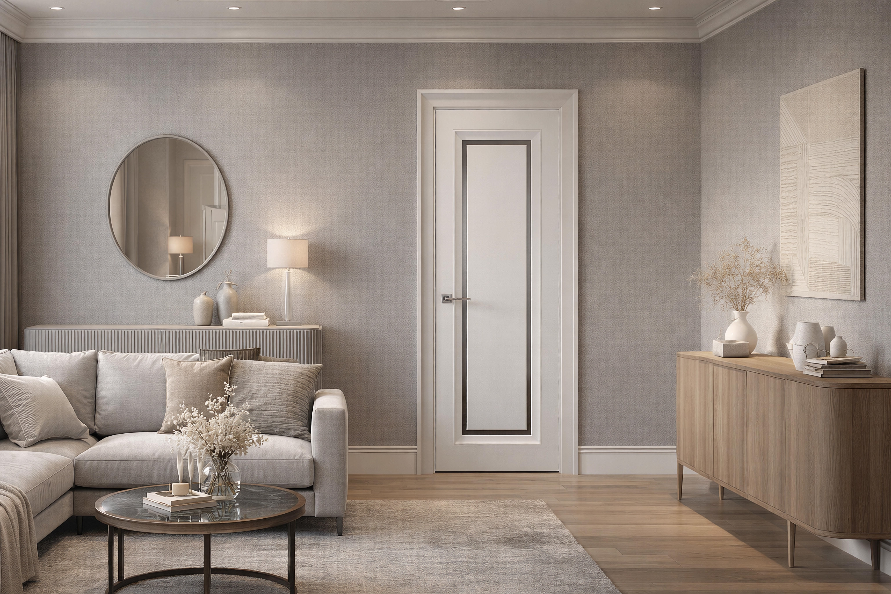Межкомнатная дверь New Style NS 28-CP в неоклассическом стиле. Отделка - эмаль, цвет - RAL 7035, полотно толщиной 40 мм подходит как для установки с телескопическим или компланарным наличником, так и для скрытого монтажа. Доступно изготовление в следующих системах открывания: распашная, купе, magic, книжка, пенал.