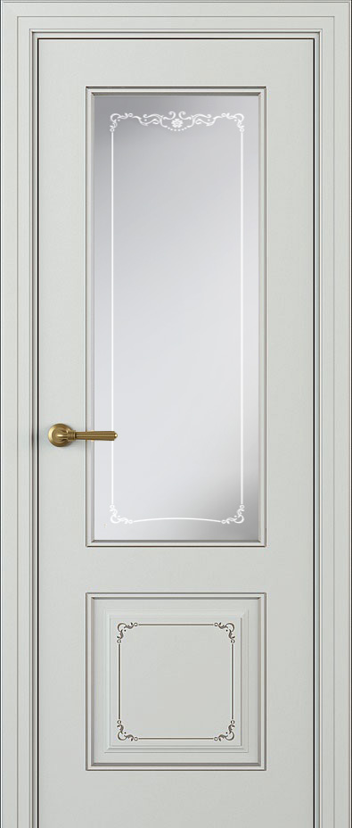 Межкомнатная дверь Камея ЛЧ13-С в стиле прованс со стеклом. Отделка - эмаль, цвет - RAL 7035, золотая патина, полотно толщиной 40 мм подходит как для установки с телескопическим или компланарным наличником, так и для скрытого монтажа. Доступно изготовление в следующих системах открывания: распашная, купе, magic, книжка, пенал.