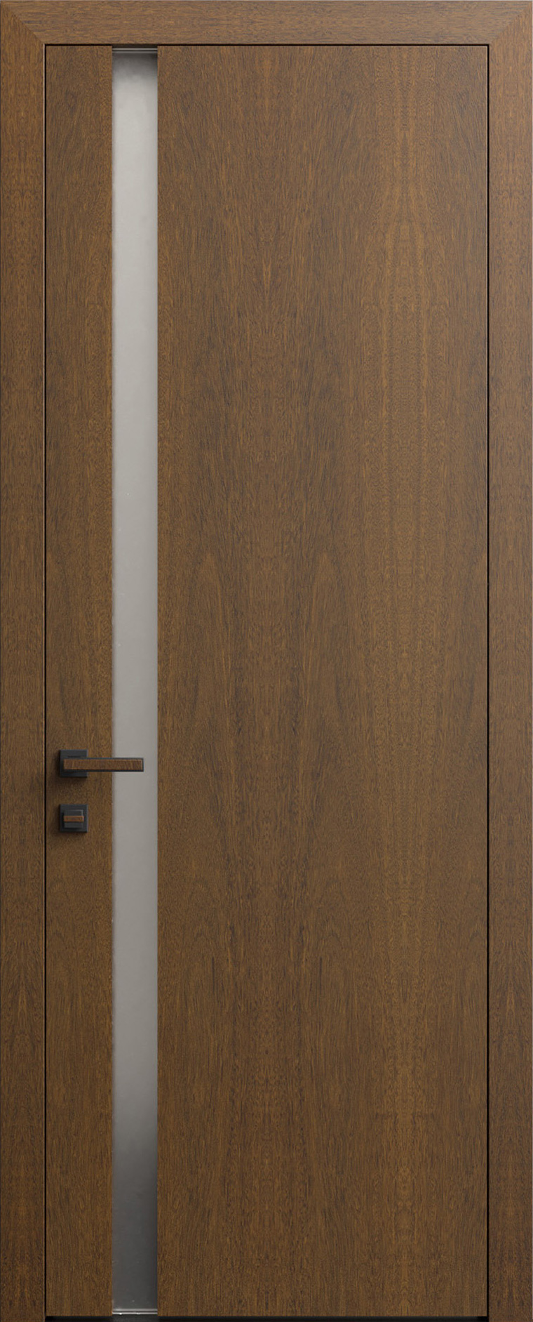 Межкомнатная дверь Практика К11 в современном стиле со стеклом. Отделка - строганный шпон, цвет - американский орех, полотно толщиной 40 мм подходит как для установки с телескопическим или компланарным наличником, так и для скрытого монтажа. Доступно изготовление в следующих системах открывания: распашная, купе, magic, книжка, пенал.